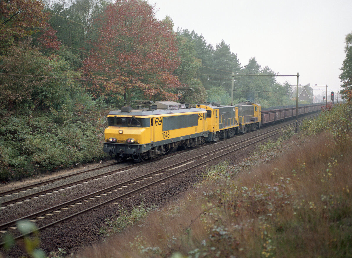 Bei einer offenen Stelle im Wald konnte ich diese Dreifachtraktion im Bild festhalten. NS 1648 und die 2 Loks der Reihe 2200 (insgesamt 2 Personale erforderlich) waren lautstark unterwegs mit Zug 48131 (Amsterdam Westhaven - Dortmund) bei km 76.7 bei Ede, am 25.10.1988. Scanbild 94838, Kodak Ektacolor Gold. Die halbhohen Fals177 der DB gab es in den Niederlanden nicht gerade jeden Tag zu sehen. Rob Freriks