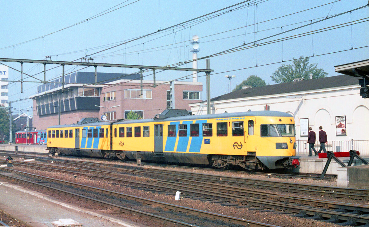 NS 162 am Bahnsteig in Zwolle als Zug 8535 (Zwolle - Kampen), 29.09.1983. Im Hintergrund das Stellwerk. Scanbild 93240, Kodacolor400.