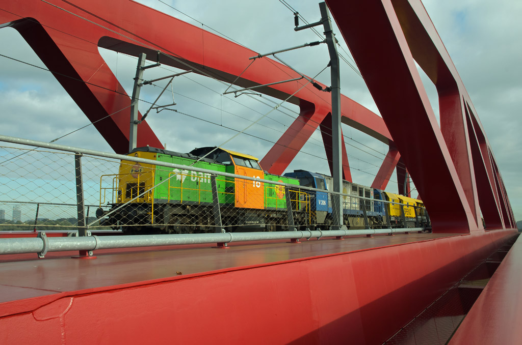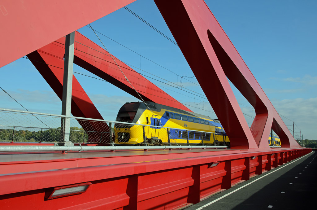 Wie zu sehen ist, bildet die Brücke tatsächlich einen Bogen. Es passiert ein DDZ-Doppelstockzug als Regionalzug nach Amersfoort - Utrecht.