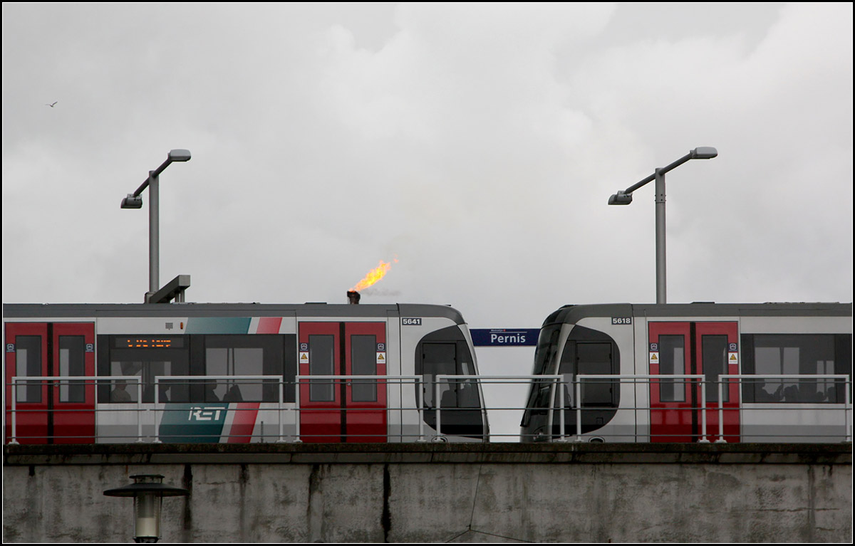 Wären wir in Rio de Janeiro könnte es sich auch um den Transport des olympischen Feuers handeln, aber wir sind hier lediglich in Rotterdam. Ein U-Bahnzug in der Station Pernis in Rotterdam.