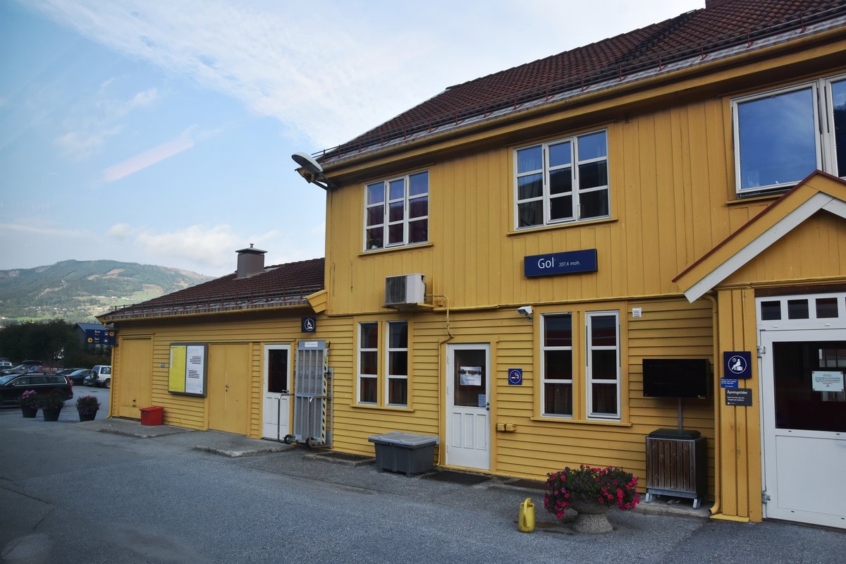 GOL (Provinz Buskerud), 09.09.2016, das Bahnhofsgebäude des Städtchens an der Bergenbahn -- aus dem Zug fotografiert
