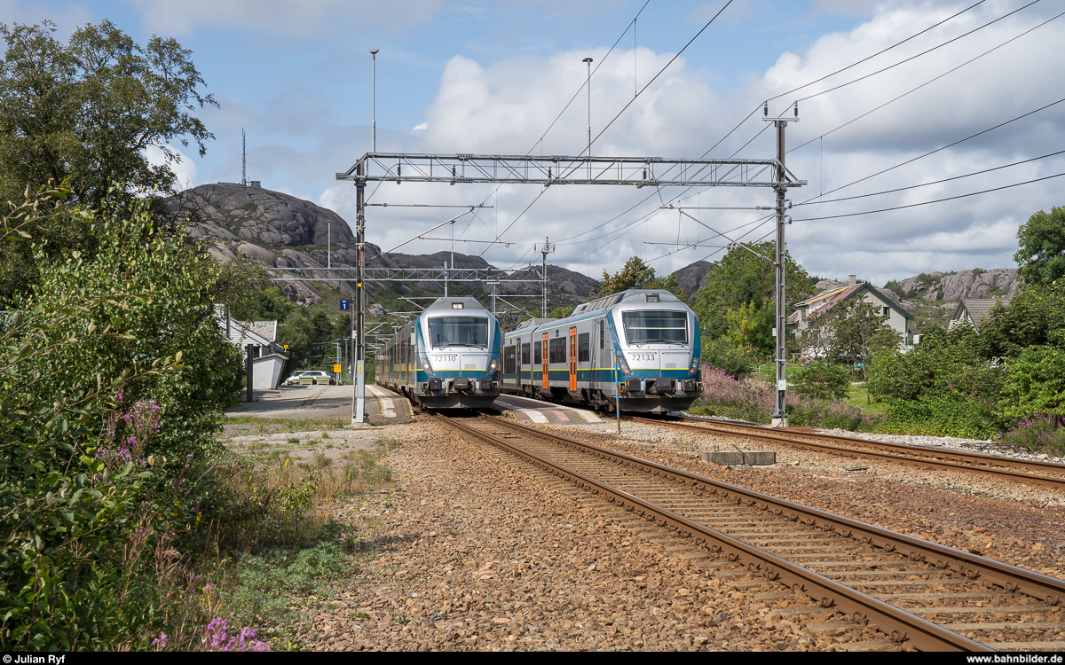 Vy BM 72 110 und 133 als Lokaltog Stavanger - Egersund und in die Gegenrichtung kreuzen sich am 20. August 2019 im Bahnhof Hellvik.