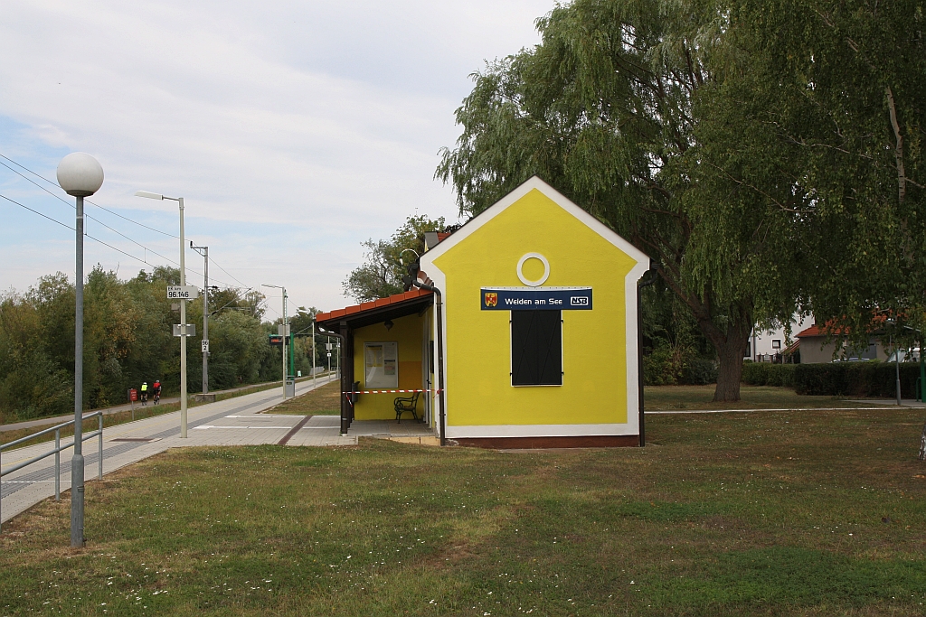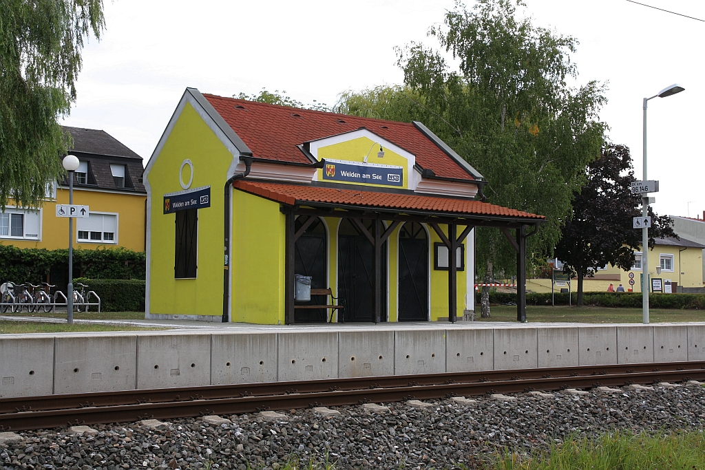 Vorbildlich restaurierte NSB-Haltestelle Weiden am See am 10.September 2017.