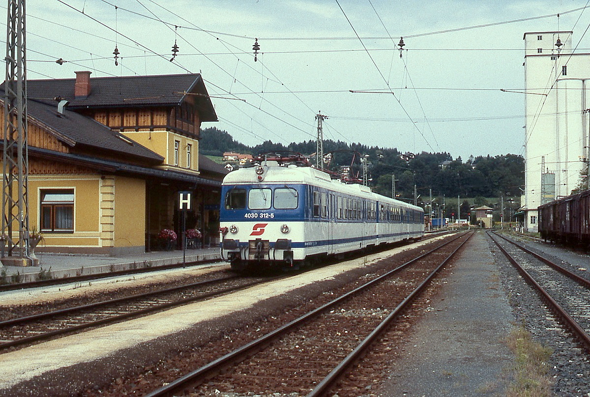 4030 312-5 wartet im September 1986 im Bahnhof Feldkirchen in Kärnten auf Fahrgäste nach Villach