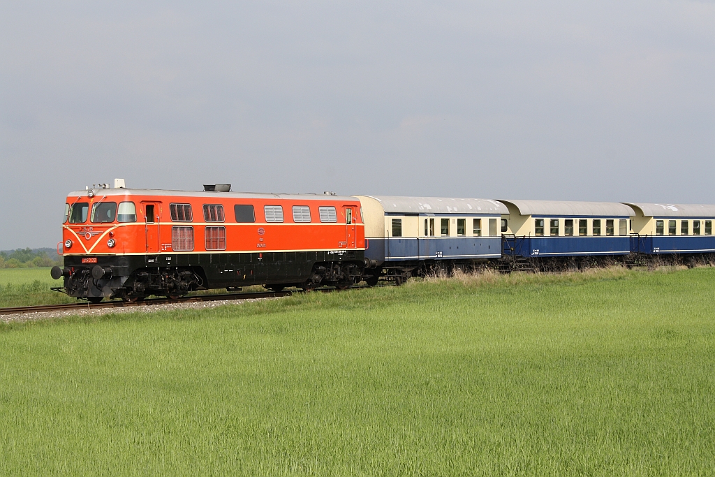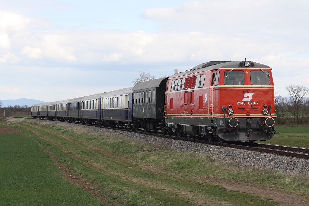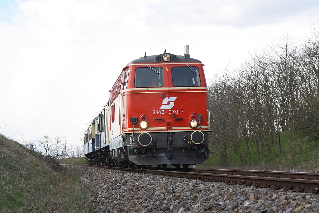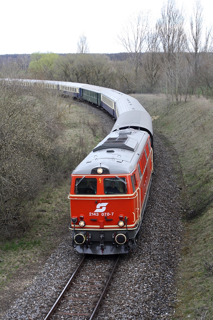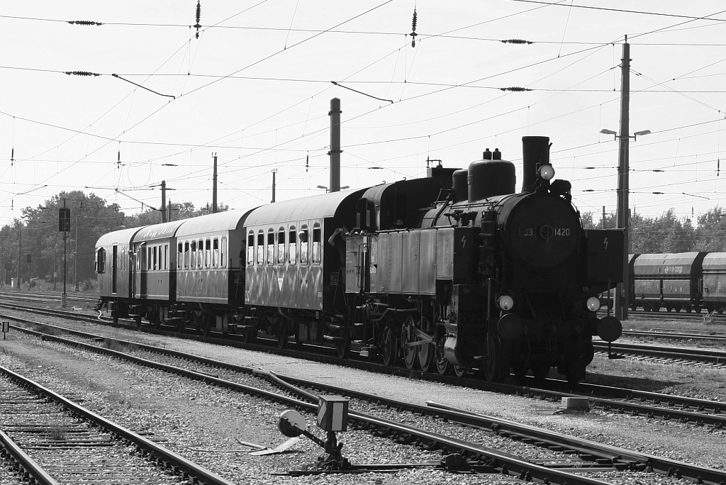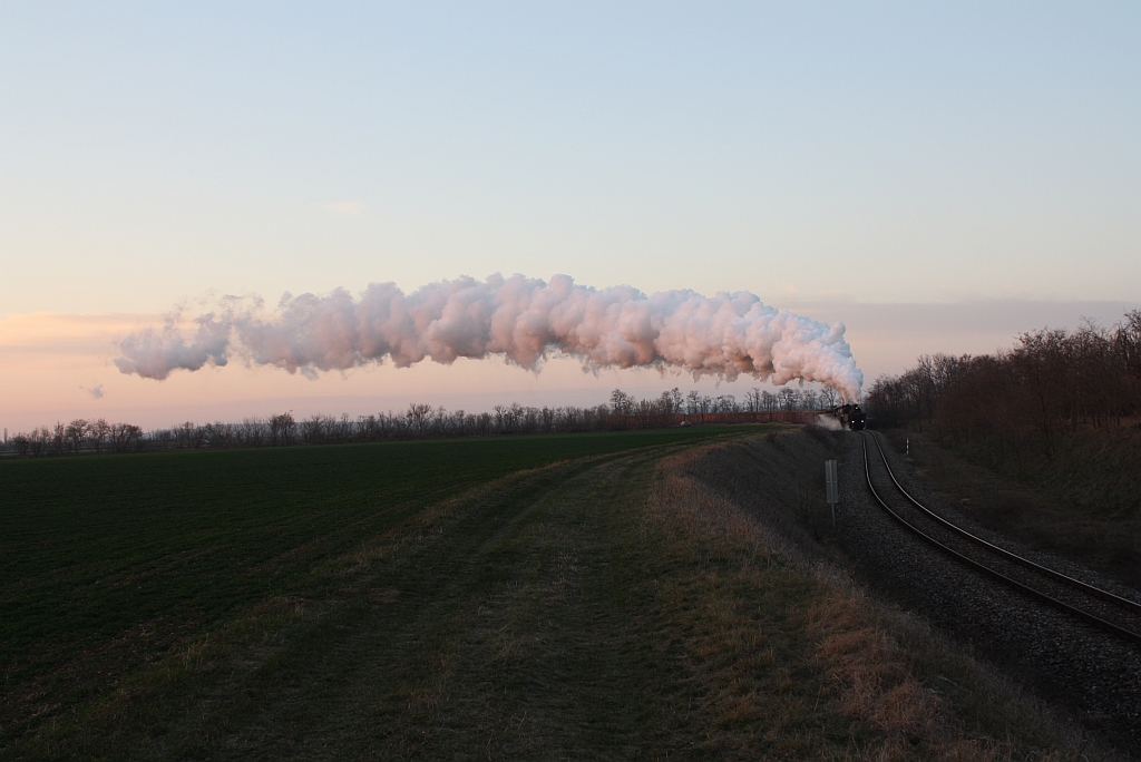 Die tiefstehende Sonne kurz vor ihrem Untergang taucht die Abdampfwolken der NLB 93.1420 und der VdEA 52.4984 in seltsam anmutendes Rosa. Aufnahme vom 09.12.2012 im letztem Bogen vor dem Bf. Hohenau. Karl Seltenhammer