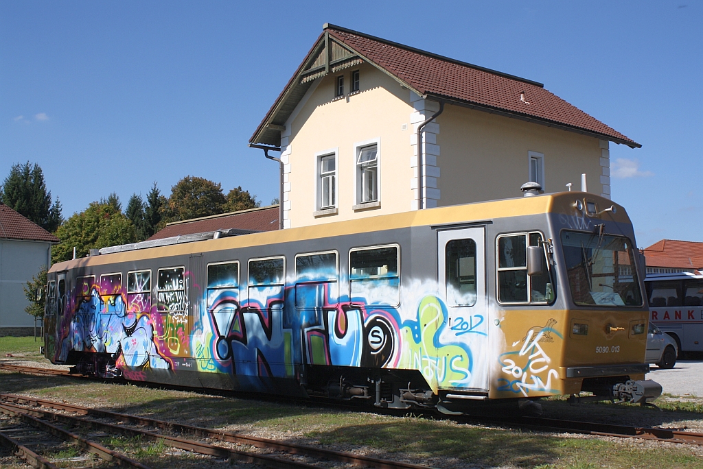 Auch die NÖVOG bleibt von Vandalismus nicht verschont. Christbaumkugel 5090.013 am 09.Sept.2012 während der Wendepause von R16926 auf R16929 im Bf. Litschau