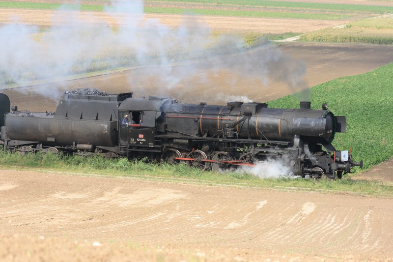 Mit weit sichtbarer Rauchfahne arbeitet sich die 52.100 des 1.öSEK mit dem "NostalgieExpress Leiser Berge" am 06.10.2012 die Steigung vor der Hst. Mollmannsdorf empor. Karl Seltenhammer