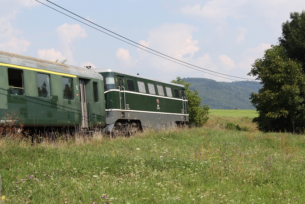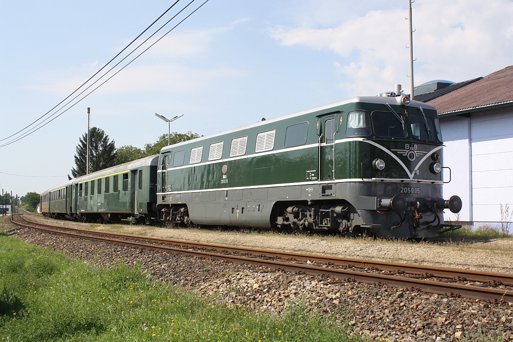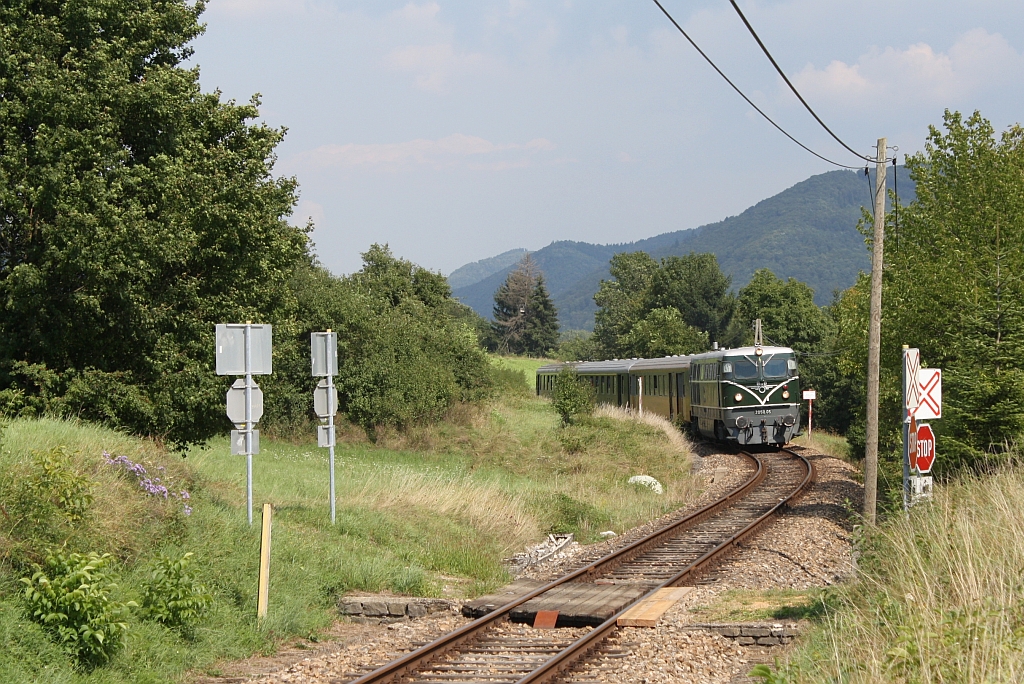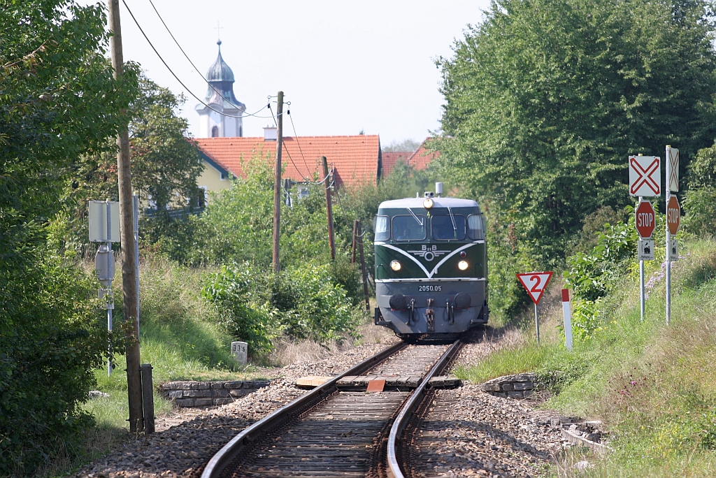 ÖGEG 2050.05 am 31.August 2013 mit dem NÖVOG R 16951 kurz nach dem Bf. Emmersdorf an der Donau beim Strecken-Km. 33,7.