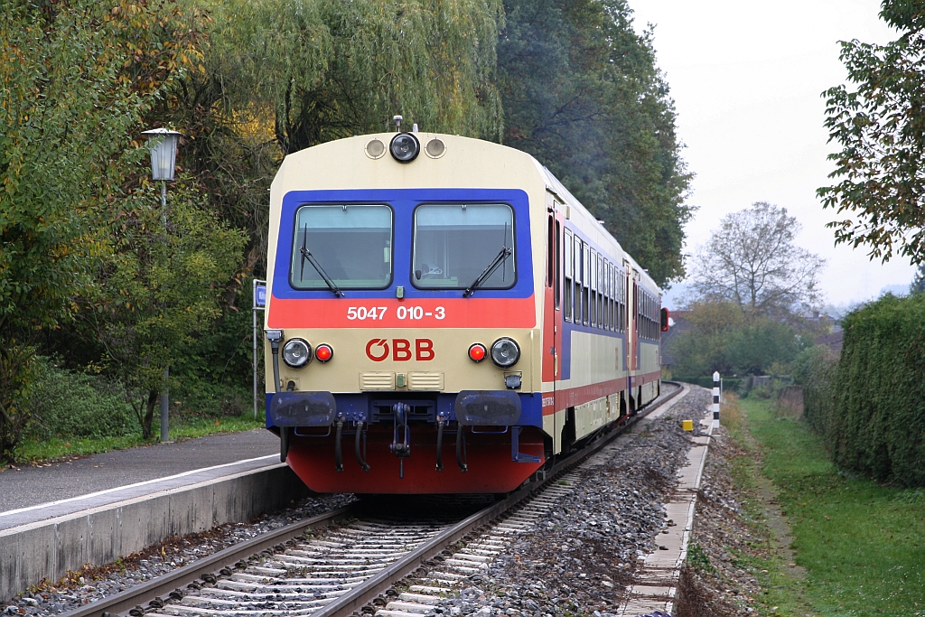 5047 010-3 und 002-0 als R 7017 von Scheibbs nach Pöchlarn verlassen am 21.Oktober 2017 die Haltestelle Mühling-Plaika.