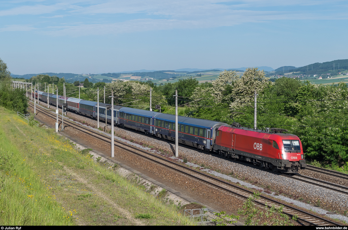 1016 018 mit dem um ca. 30 Minuten verspäteten Autoreisezug nach Wien am 29. Mai 2017 auf der Westbahn kurz vor St. Pölten.