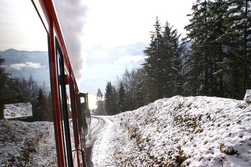 Salzkammergut 2009 - Zwei Züge der Schafbergbahn warten am 25.05.2009 in St. Wolfgang Schafbergbahnhof auf Fahrgäste um sie in rund 40 min Fahrzeit auf 1.732m Höhe zu bringen. Jens Kaubisch