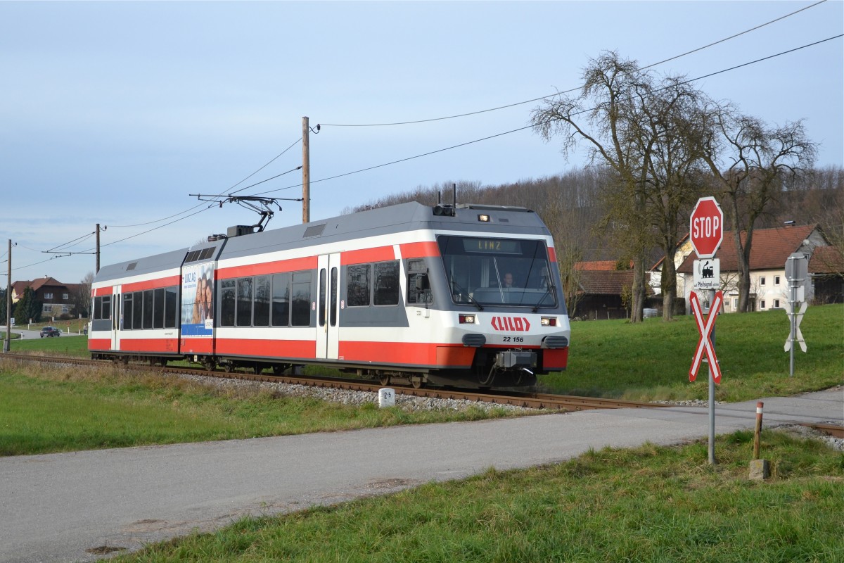 Kurz nach Verlassen des Bahnhofs Niederspaching wurde der ET 22 108 (Simmering-Graz-Pauker 1951) im Sommer 1992 auf der Fahrt nach Neumarkt-Kallham aufgenommen, im Vordergrund das Gleis nach Peuerbach. Der Triebwagen stammt von der Salzburger Lokalbahn (dort ET 32). Horst Lüdicke