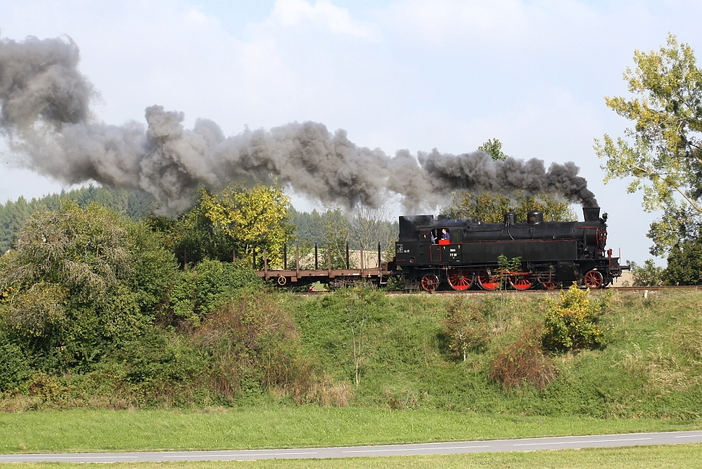 ÖGEG 77.28 fährt am 03.Oktober 2014 mit dem SGAG 17634 in Bf. Hausruck ein.