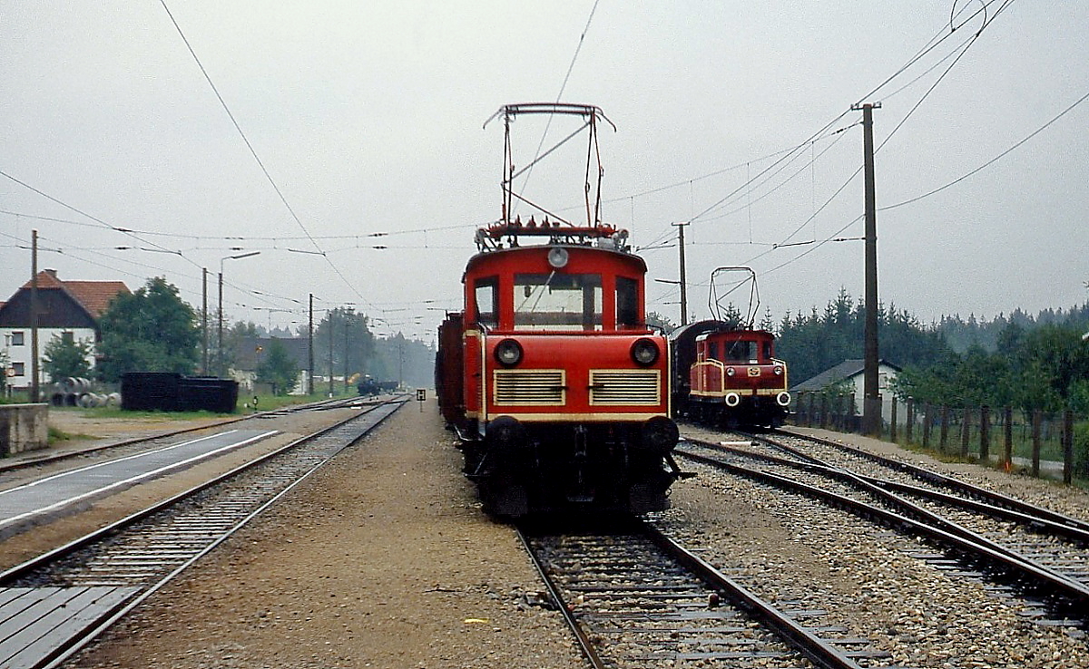 Im Sommer 1980 treffen sich die E 27.001 von Stern & Hafferl sowie eine E-Lok der Salzburger Lokalbahn im Bahnhof Bürmoos. Die von der SAKOG, einem Unternehmen mit Stern & Hafferl-Beteiligung, für die Beförderung schwerer Kohlenzüge eingesetzte Lok wurde nach Beendigung des Kohleabbaus an die Salzburger Lokalbahn verkauft und dort als E 64 eingesetzt.