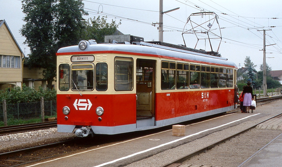 Im Sommer 1980 wartet der ET 20.109 von Stern & Hafferl im Bahnhof Bürmoos auf Fahrgäste nach Trimmelkam. Auch das Stückgut wartet noch auf seine Verladung. Der Triebwagen wurde 1956 von der Waggonfabrik Rastatt gebaut und an die Extertalbahn geliefert, die ihn nach Einstellung des Personenverkehrs 1969 an Stern & Hafferl verkaufte.