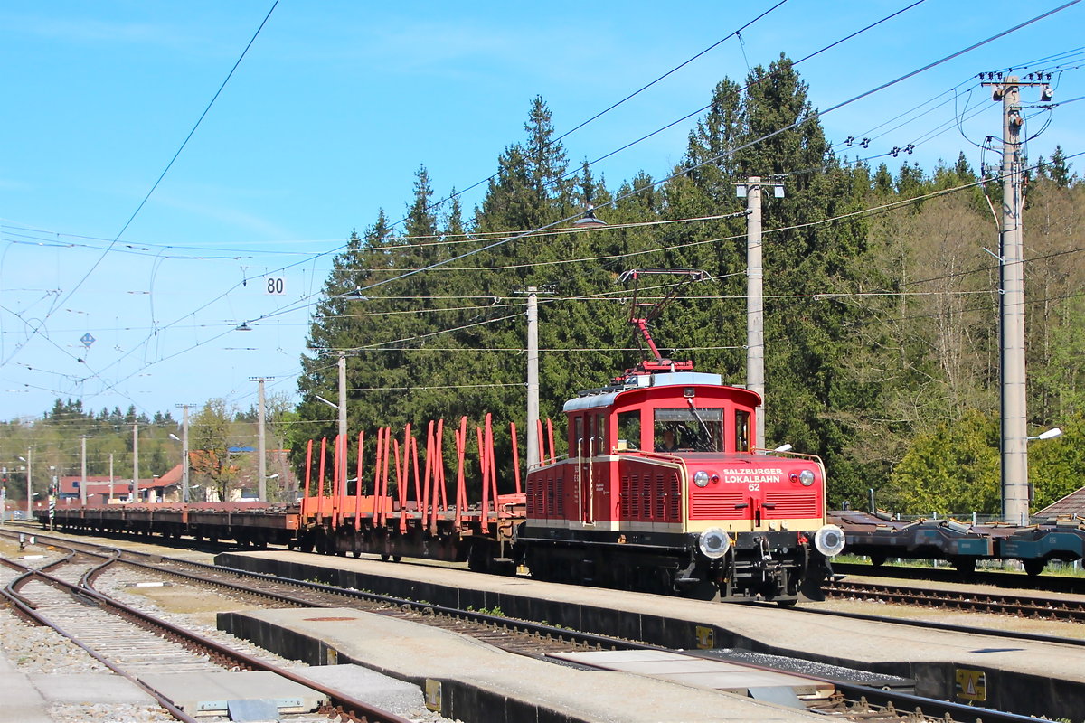 SLB E 62 mit Güterzug bei der Ausfahrt aus dem Bahnhof Bürmoos aufgenommen am 15.4.2020. Durch den Rückgang des Güterverkehrs auf der Stammstrecke der Salzbuger Lokalbahn ist es mittlerweile ein seltenes Bild einen Güterzug nördlich von Weitwörth/Nussdorf anzutreffen. Der Zug bestand zum überwiegenden Teil aus Waggons (Laas) der Fa. Transwaggon und war für einige Monate in Bürmoos hinterstellt.