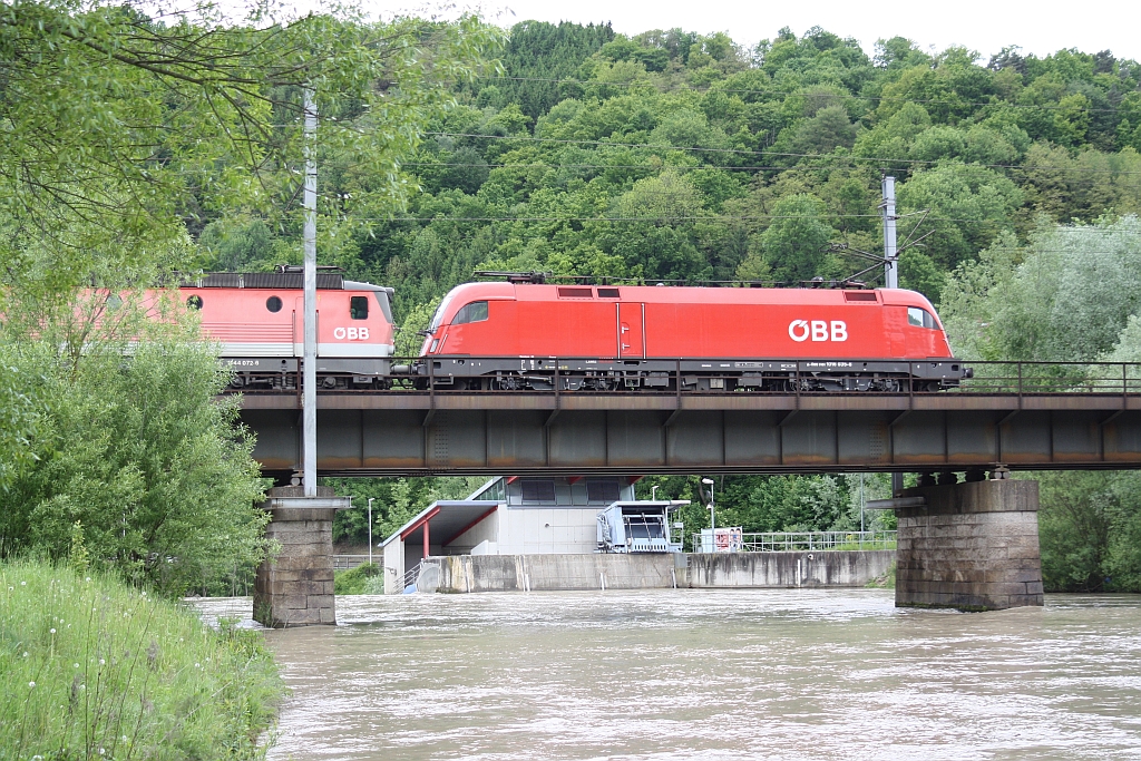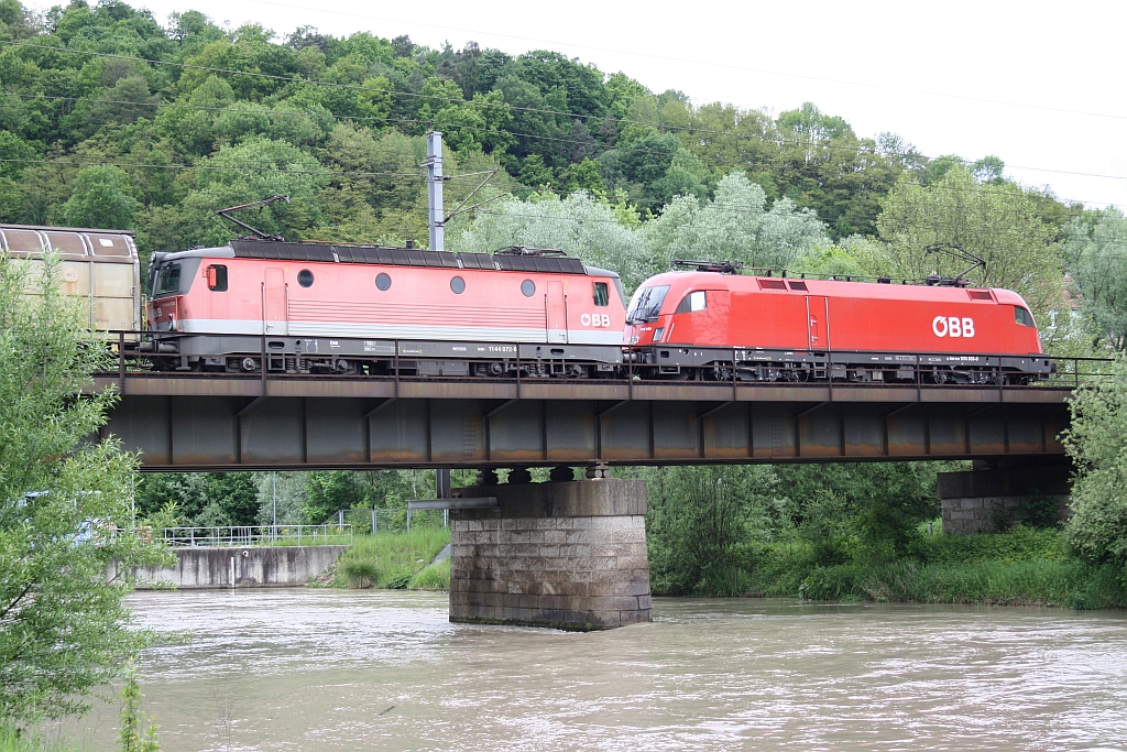1016 035-8 und 1144 072-6 am 17.Mai 2014 vor einem Güterzug auf der Brücke über den Mürzbogen bei Kapfenberg.