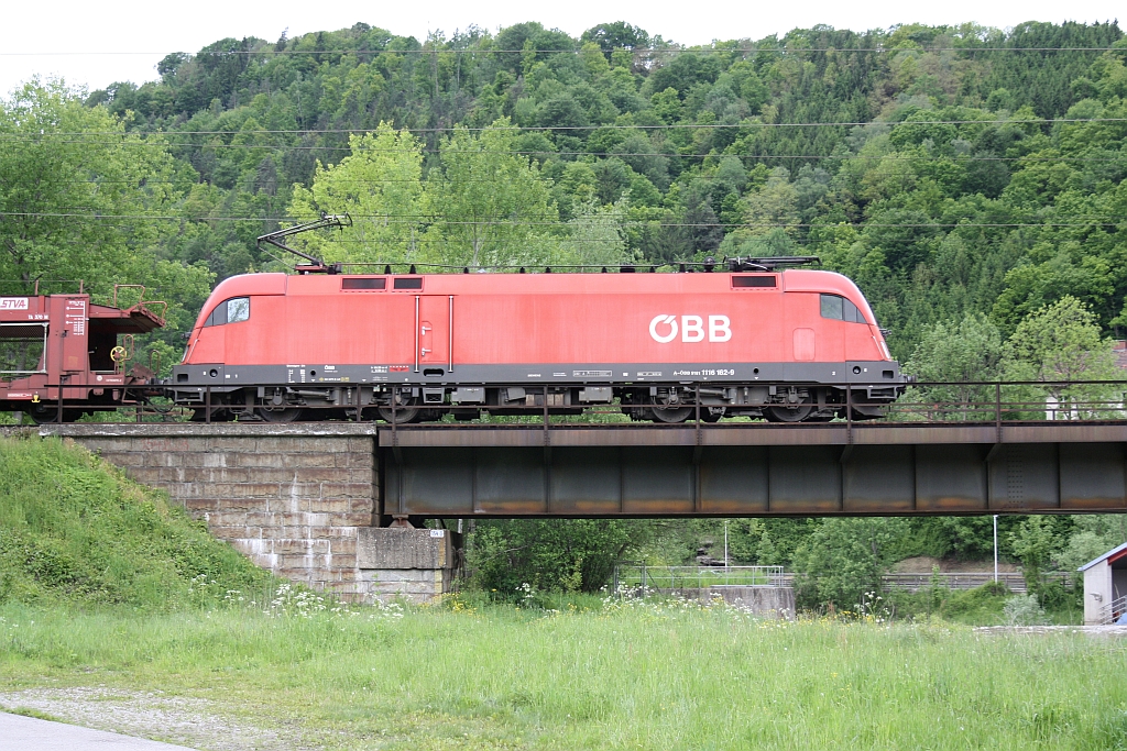 1116 162-9 am 17.Mai 2014 vor einem Güterzug auf der Brücke über den Mürzbogen bei Kapfenberg.