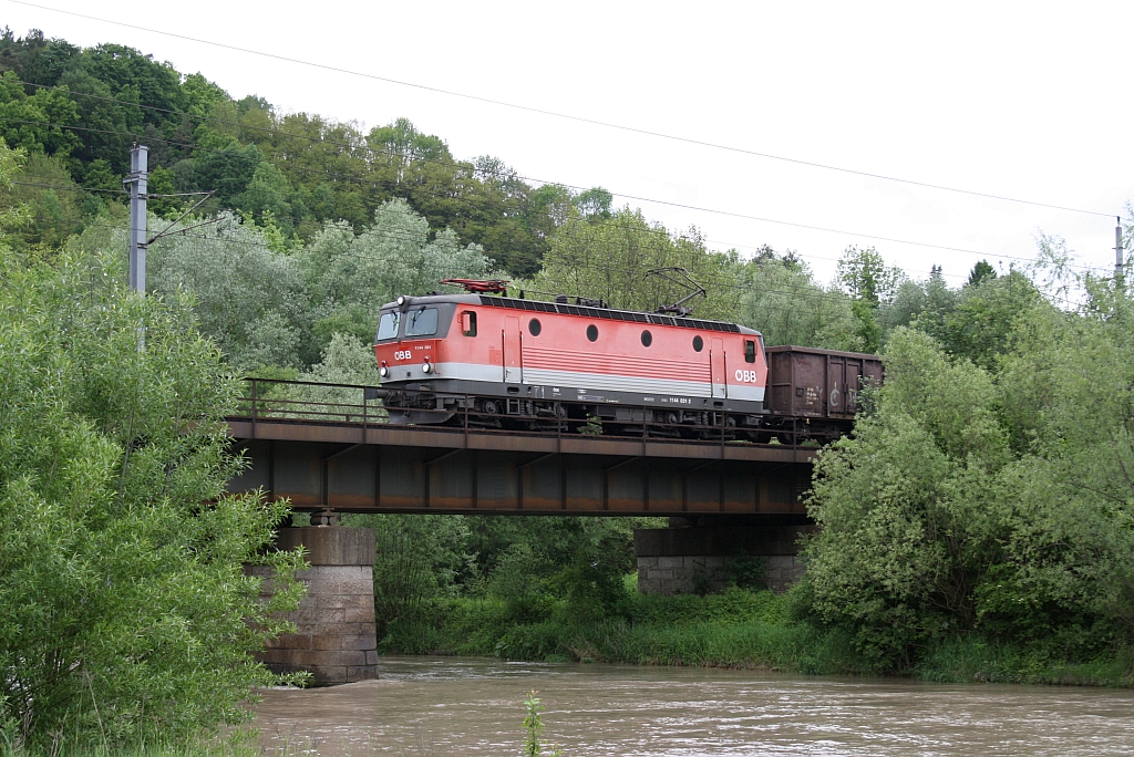 1144 031-2 am 17.Mai 2014 vor einem Güterzug auf der Brücke über den Mürzbogen bei Kapfenberg.