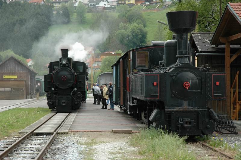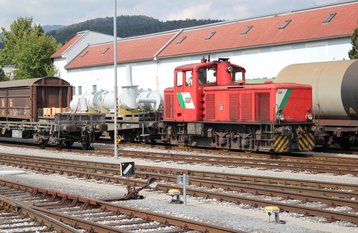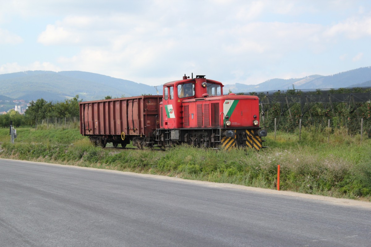 Die DE 2 der STLB bei Verschubarbeiten bei KM 12,0 der Landesbahn Gleisdorf - Weiz, im Vordergrund ist die neue (Bauarbeiten noch nicht abgeschlossen) Umfahrungsstraße Preding - Weiz zu sehen, Die DE 2 gerade von einem Betriebsanschlussgleis kommend, hat gerade Güterwaggons in einem großen Werk im Süden von Weiz (Ortsgebiet Preding) abgeliefert und hält hier bis die Weiche nach einem kurzen Halt wieder gewendet wird und die DE 2 sich wieder auf den Rückweg Richtung Weiz macht, Anfang September 2013 ( im Hintergrung sieht man eine typisch steirische Apfelplantage und wenn man genau hinschaut sieht man die schon fast reifen Ãpfel)