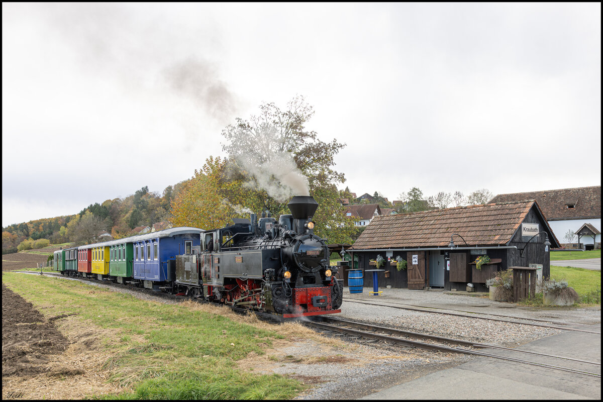 Für eine Gruppe Fotografen fuhr am 8.11.2025 die ehemalige Zillertalbahn D8 mit der Garnitur des "Flascherlzug" auf der Stainzer Lokalbahn von Stainz nach Preding-Wieselsdorf und zurück hier kurz hinter Stainz. Max Kiegerl