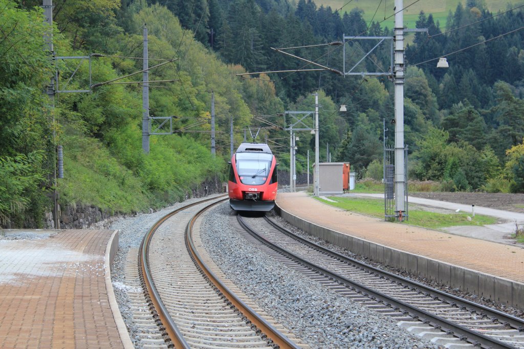 Die S4 der Tiroler Schnellbahn fährt nur zweimal am Tag den Bahnhof Patsch an, zur fahrplanmäßigen Ankunft um 14:02 Anfang Oktober hatte ich die S4 beim Halt im Bahnhof Patsch vor der Linse. Michael Grinschgl