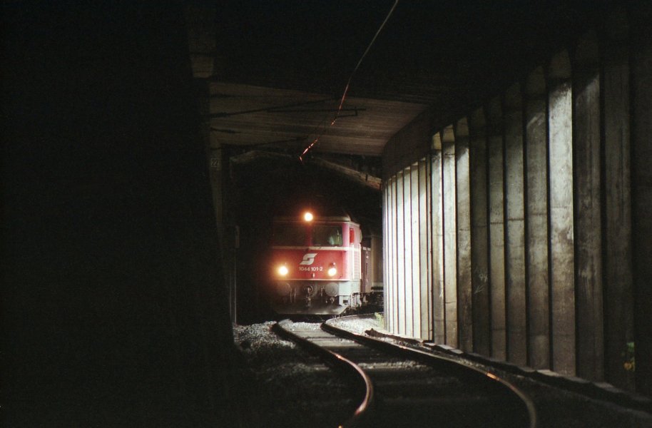 1044 101 zieht am 21.09.1996 einen Güterzug Richtung Bludenz und ist hier unter dem Lawinenschutzdach Schnend-Batzigg oberhalb von Wald am Arlberg unterwegs. Uwe Busch
