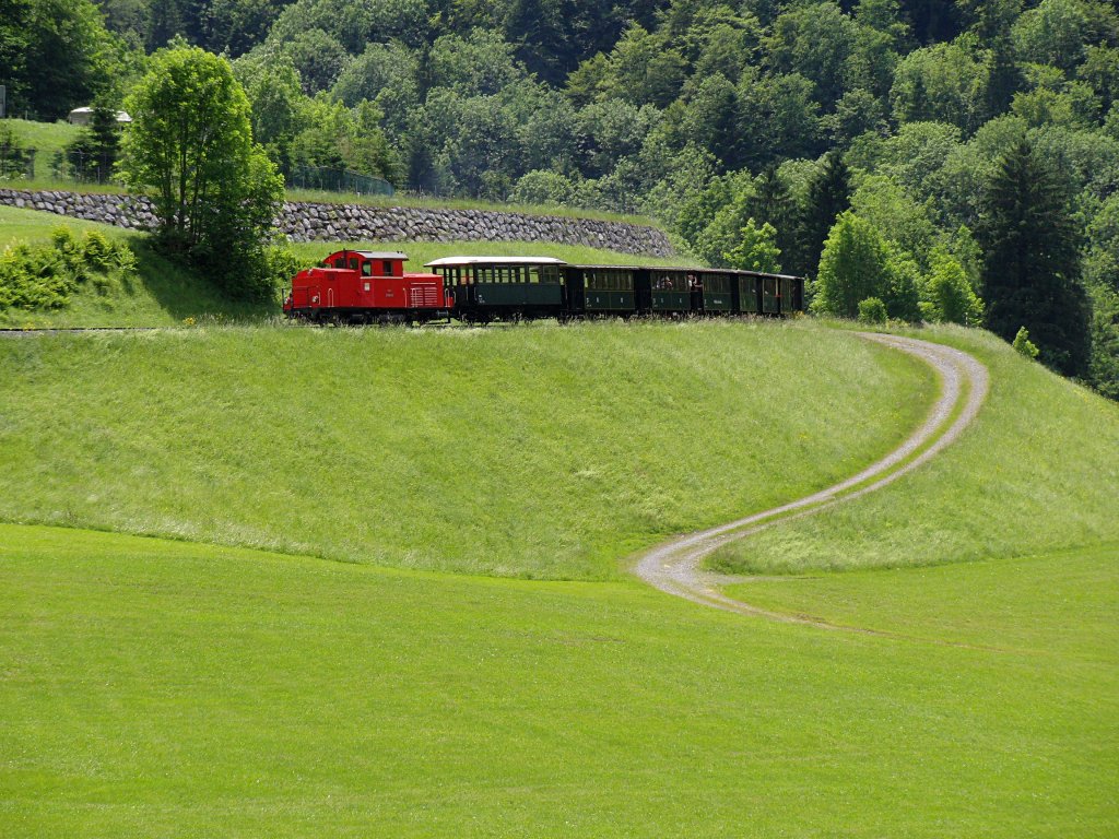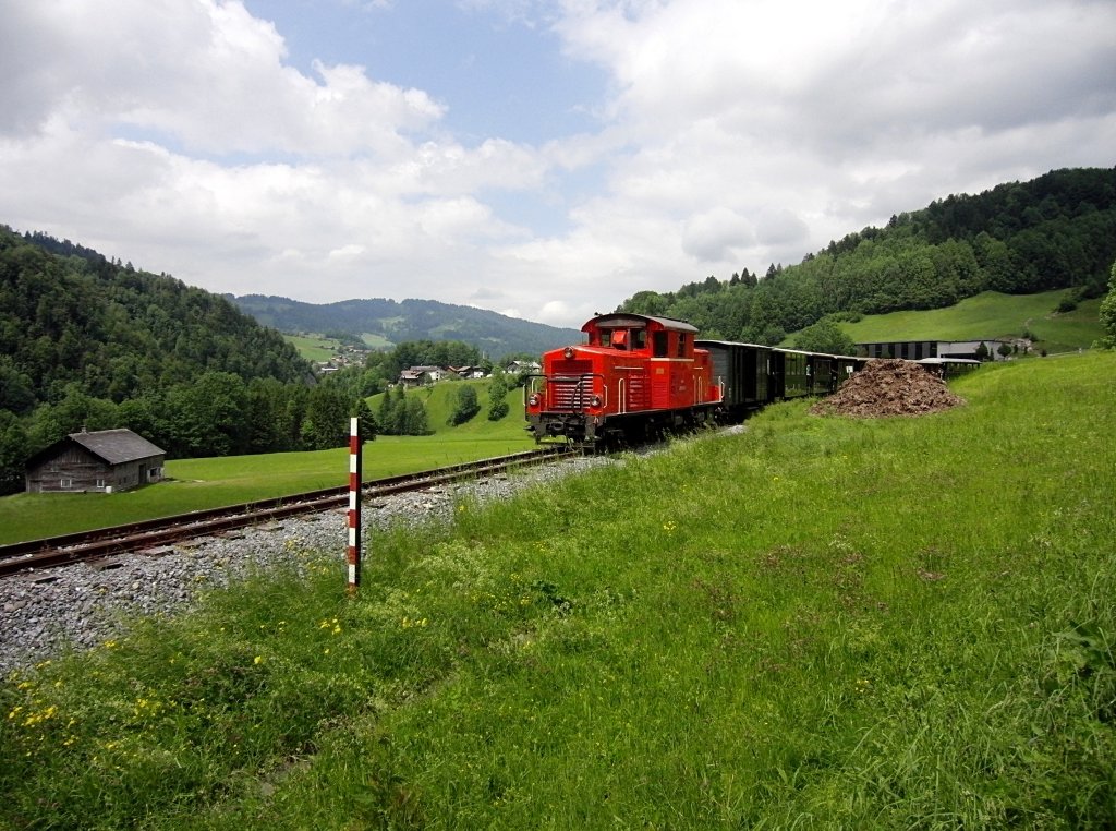 Oje! Motiv teilweise durch Misthaufen verdeckt. 500 m nach der Abfahrt im Bahnhof Schwarzenberg passiert am 03.06.2012 das Wälderbähnle das Vorsäß Löchle und hat noch 4,5 km zu ihrem Ziel- und zugleich Endbahnhof in Bezau vor sich.