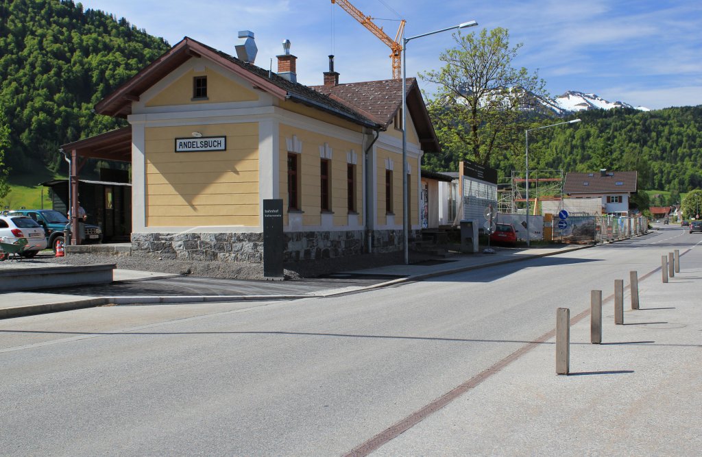 Der Bahnhof von Andelsbuch ist per Eisenbahn zwar nicht mehr erreichbar, erstrahlt aber im  Hochglanz . Zwei abgestellte Güterwaggons, einer davon ist ganz links im Bild in grüner Farbe erkennbar fristen ihr Dasein auf einem Schienenstrangrest im Bahnhofsbereich. Mai 2012
