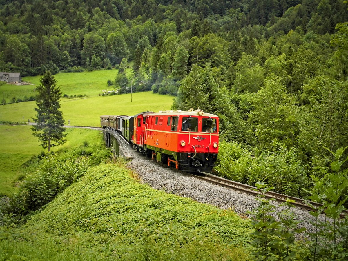 Wenige hundert Meter vor ihrem Ziel- und zugleich Endbahnhof zieht am 03.06.2012 die Diesellok 2091.08 (Baujahr 1940) die Wagen der Bregenzerwaldbahn die Steigung zum Bahnhof Schwarzenberg hinauf. Von der ehemals 35 km langen Bregenzerwaldbahn zwischen Bregenz und Bezau, die von 1902 bis 1980 von der ÖBB betrieben wurde, werden seit 1987 auf der 5 km langen Strecke zwischen Bezau und Schwarzenberg Museumsbahnfahrten durchgeführt.