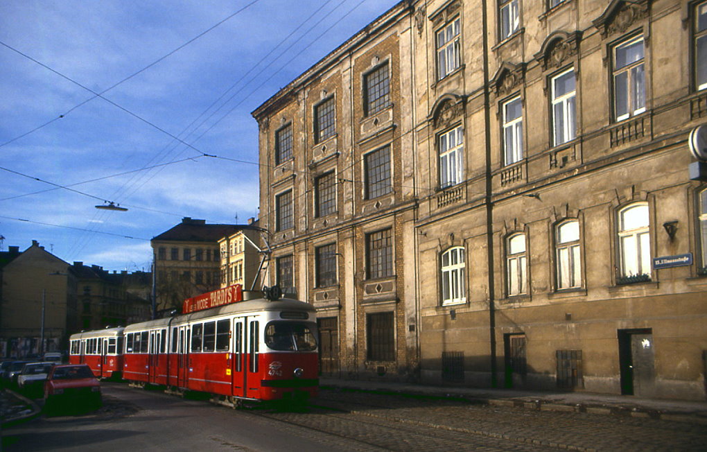 Wien Wiener Stadtwerke-Verkehrsbetriebe (WVB) SL 8 (E1 4842 (SGP 1975)) XV, Rudolfsheim-Fünfhaus, Sechshaus, Ullmannstraße / Diefenbachgasse im Juli 1977. - Scan eines Diapositivs. Kamera: Leica CL. Kurt Rasmussen