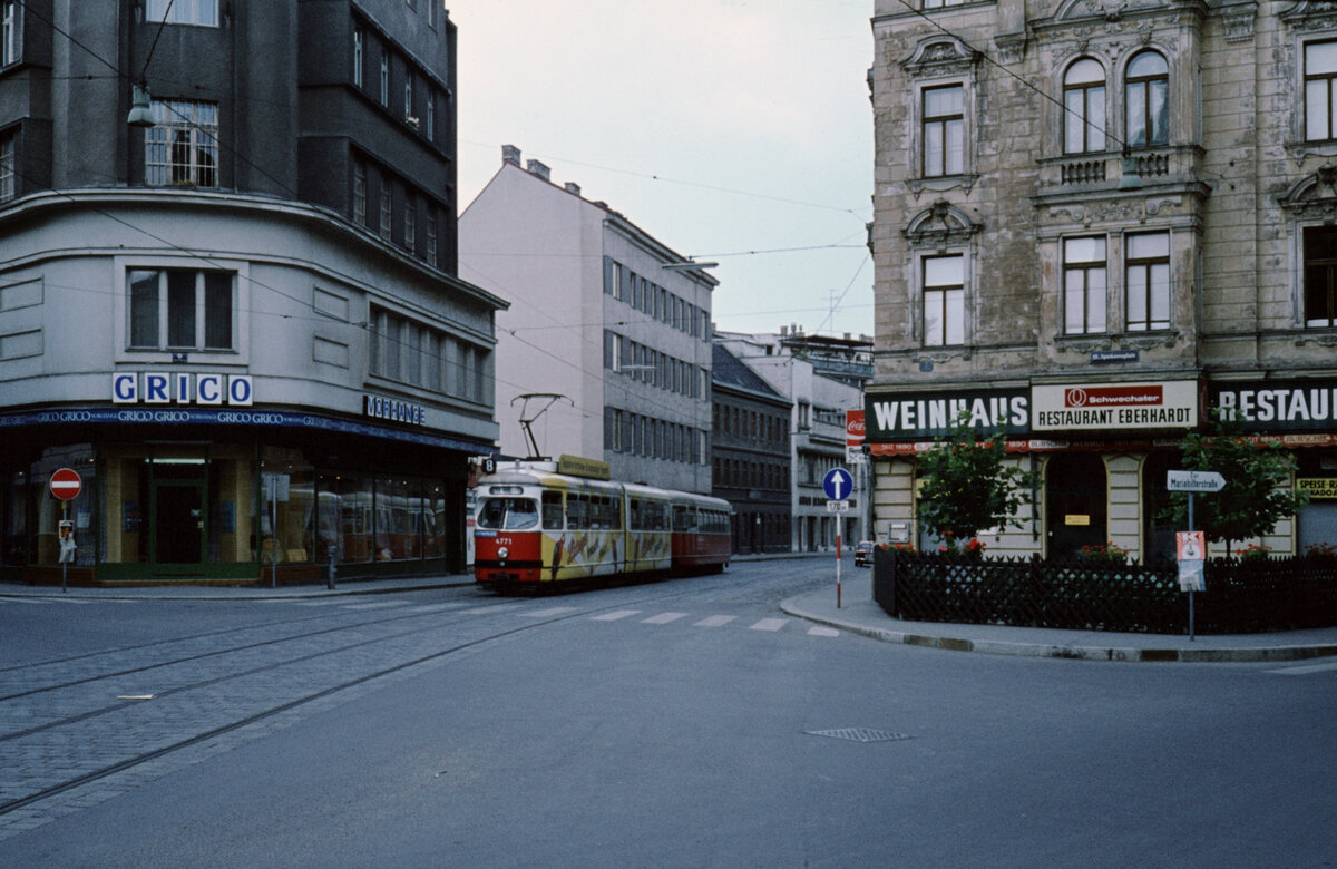 Wien Wiener Stadtwerke-Verkehrsbetriebe (WVB) SL 8 (E1 4771 (SGP 1972)) XV, Rudolfsheim-Fünfhaus, Sechshaus, Ullmannstraße / Sparkassaplatz im Juli 1977. - Scan eines Diapositivs. Kamera: Leica CL. Kurt Rasmussen