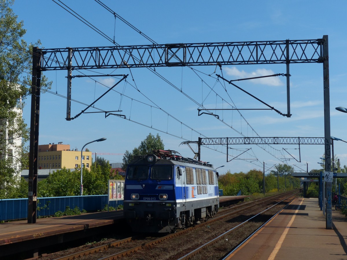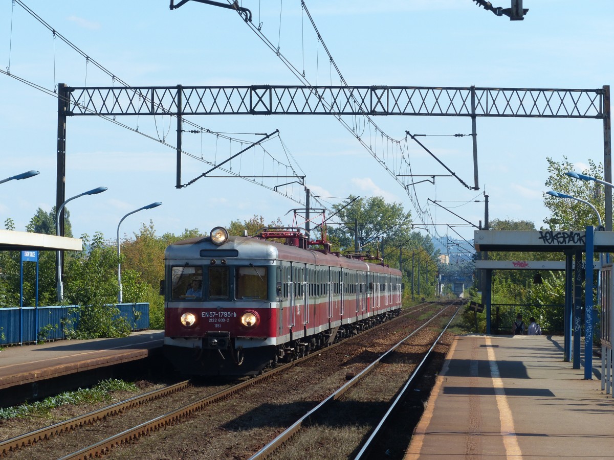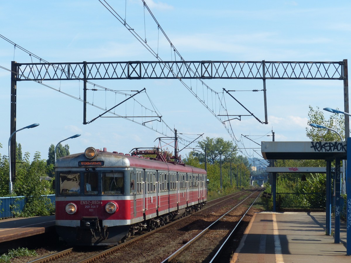 EN71-005 in Richtung Dworzec Główny Kraków bei der Durchfahrt durch Kraków Zabłocie. Die Baureihe EN71 ist eine Adaption der bekannten Baureihe EN57, die teils durch Neubau (1976) und teils durch Umbau von EN57-Zügen (1976-2003) entstanden ist. 10.9.2013 Thomas Wendt