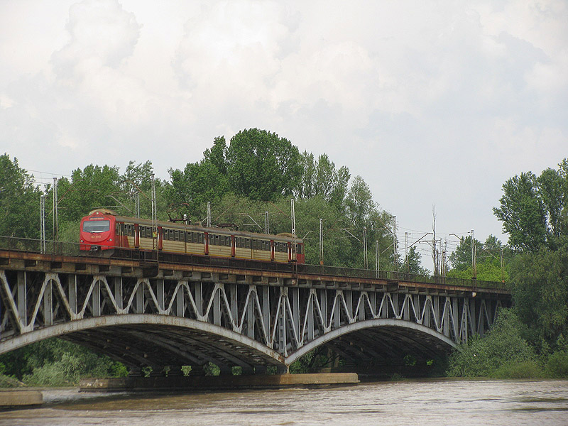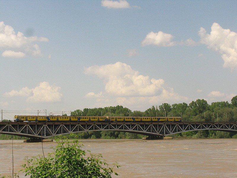 Eine Garnitur von 2xEN57 (gemietet von PKP SKM Trójmiasto) als ein Zug der Linie S2 überquert Wisła während der ersten Hochwasser-Welle (21.05.2010). fafax