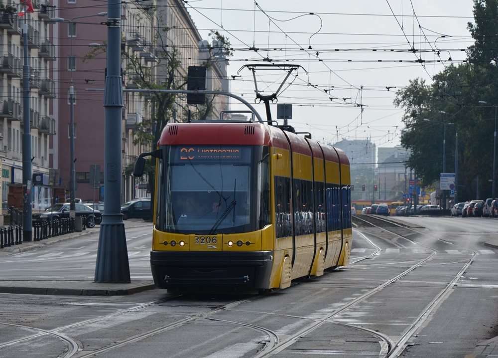 Der PESA 128N besticht durch eine markante, streitbare Form. In Warschau verkehren 45 dieser in den Jahren 2014 und 2015 beschafften Straßenbahnzüge. 17.4.2019, Centrum Thomas Wendt