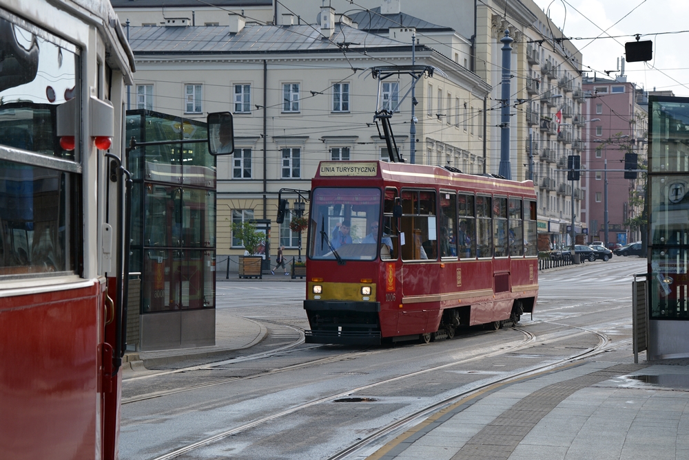 12.08.2017, Warszawa (Warschau), Aleja "Solidarności". "Historische" Straßenbahn Konstal 105Na #1006 auf der Touristenlinie T erreicht die Haltestelle Metro Ratusz Arsenał und passiert die ältere Straßenbahn Typ K #403. Łukasz Łyszczak