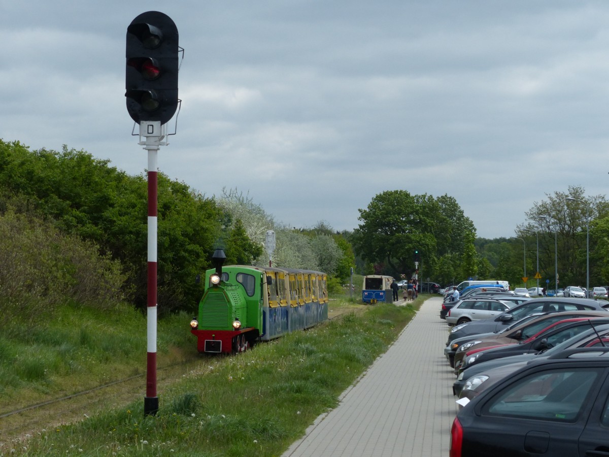 Parkeisenbahn Maltanka in Poznan: Die 3,8 Kilometer lange 600 mm-Strecke wird am Wochenende mit zwei Dieselzügen bedient, die im Halbstundentakt fahren. Der Zug hat gerade die Therme (Termy Maltańskie) verlassen und fährt weiter in Richtung Zoo. 4.5.2014, Poznan Thomas Wendt