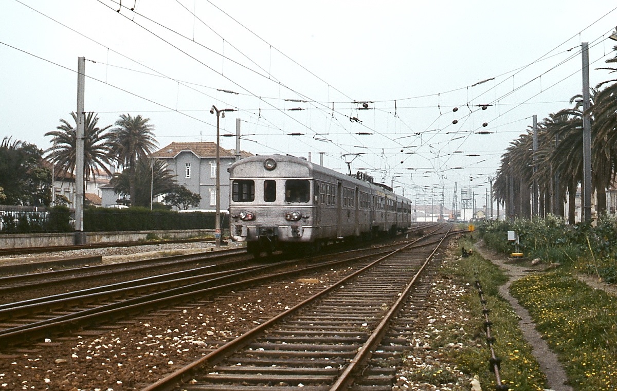 Mit einem langen Personenzug trifft eine Lok der Reihe 2500 am 28.04.1984 im Bahnhof Espinho südlich von Porto ein. Die CP beschaffte 1956 bei Alsthom 15 dieser Lokomotiven, die letzten wurden 2009 abgestellt. Der oberirdische Betrieb endete hier 2008, nachdem die Bahnstrecke in einen Tunnel gelegt wurde.