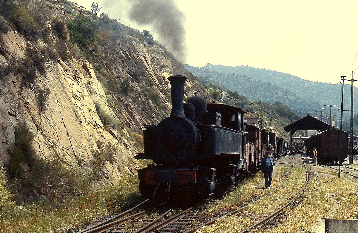 Schmalspurdampflokomotiven in Portugal: CP 3 059 056-4 am 27.04.1984 abgestellt in Tua. Die Lok gehört zu einer Serie von sechs Cn2t-Lokomotiven, die Emil Kessler/Esslingen 1889 an die Compania National de Caminhos de Ferro (dort Nr. 1-6, später CP E 51-56) lieferte. Horst Lüdicke