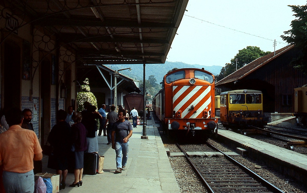 Szene mit Hund. Auf dem Bahnhofsgelände von Tua steht rechts der Triebzug 9702/9732/9701, links rostet Lok E 164 einer ungewissen Zukunft entgegen, dazwischen der Bahnhofshund (12. Mai 1988). - In Tua nimmt die "Linha do Tua" nach Bragança ihren Ausgang, die jedoch seit 1990 nur noch bis Mirandela befahren wird. Hans-Joachim Ströh
