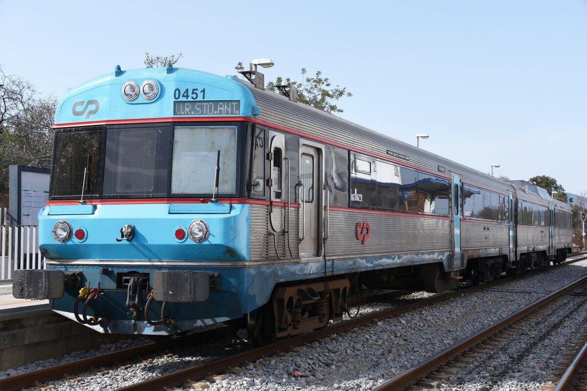 MONCARAPACHO e FUSETA (Distrikt Faro), 06.02.2020, Zug Nr. 0452 als Regionalzug nach Vila Real de Santo António im Bahnhof Fuseta-A; durch die Schräglage ist das Einsteigen nicht ganz einfach