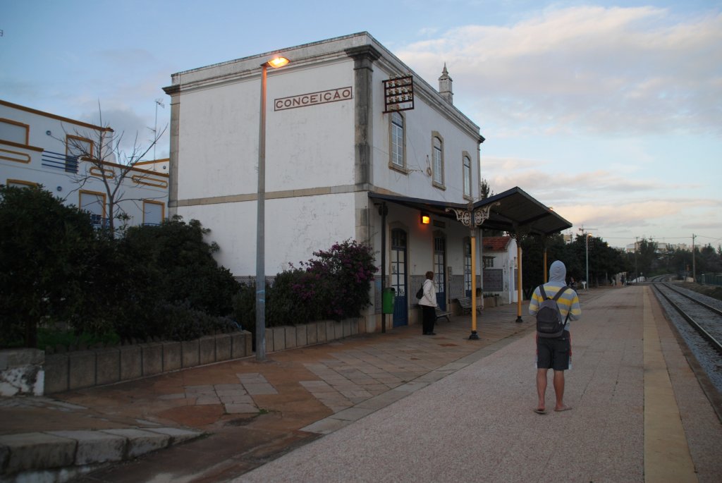 CONCEIÇÃO de Tavira (Distrikt Faro), 11.02.2010, ein Regionalzug nach Vila Real de Santo António hat soeben den gleichnamigen Bahnhof verlassen und unterquert in Kürze die EN 125 Reinhard Zabel