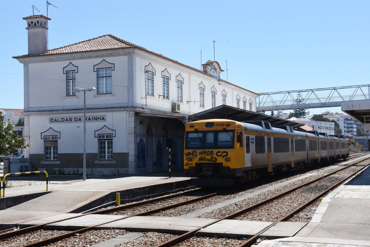 CALDAS DA RAINHA (Distrikt Leiria), 15.08.2019, Zug Nr. 0454 als InterRegional nach Meleças nach Ausfahrt aus dem Bahnhof; am Ziel, einem Vorort von Lissabon, kann dann so etwas wie eine eine S-Bahn (Comboio Suburbano) zur Weiterfahrt ins Stadtzentrum von Lissabon genutzt werden Reinhard Zabel
