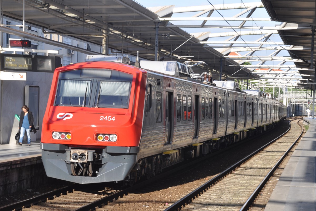 LISBOA (Distrikt Lisboa/Concelho Lisboa), 23.04.2014, links ein Nahverkehrszug des privaten Bahnbetreibers Fertagus nach Setúbal, rechts ein Nahverkehrszug der staatlichen Gesellschaft CP nach Lisboa Oriente im Bahnhof Roma-Areeiro Reinhard Zabel