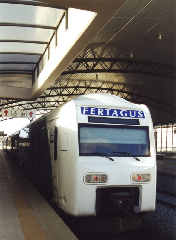 LISBOA (Distrikt Lisboa/Concelho Lisboa), 25.01.2001, der Fertagus, ein Zug eines privaten Bahnbetreibers, der die Stadt über die Ponte 25 de Abril mit ihren südlich des Rio Tejo gelegenen Vorstädten verbindet, beim Halt im Bahnhof Sete Rios auf der Linha de Cintura -- Foto eingescannt