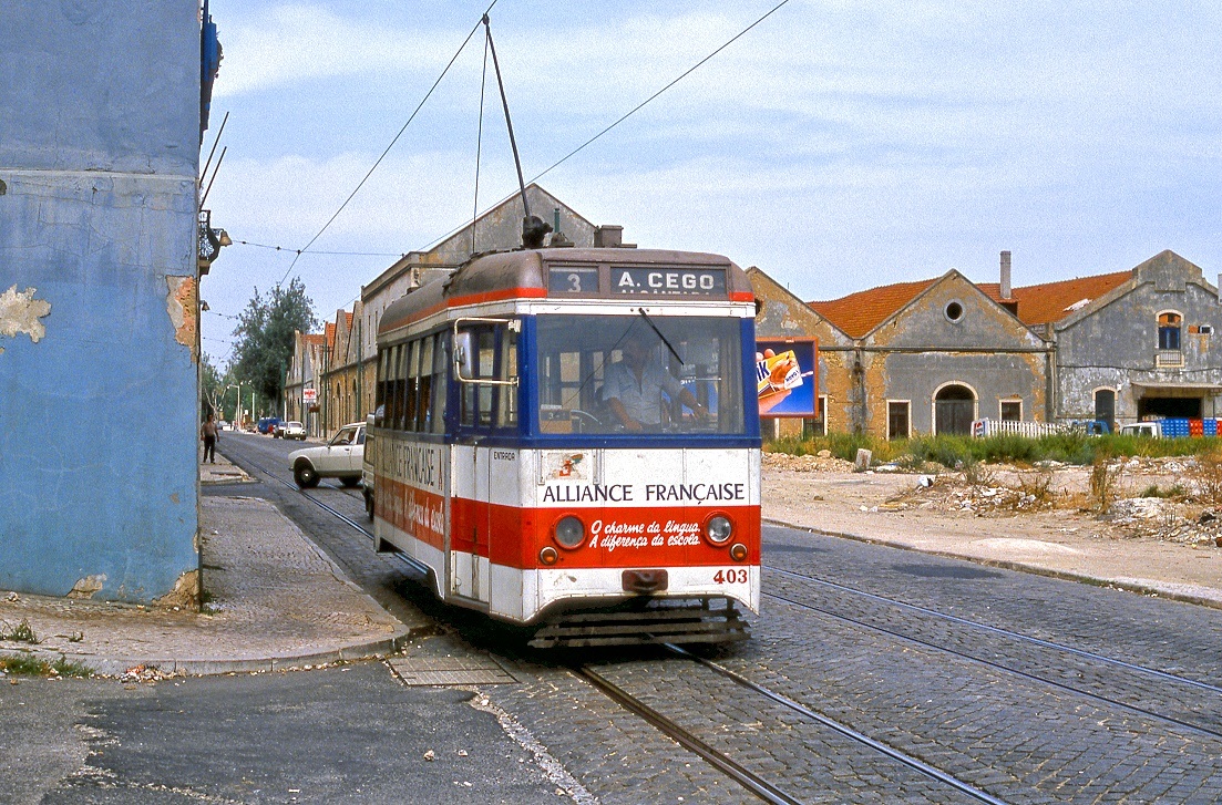 Einige Kilometer östlich der Altstadt von Lissabon war von Romantik und Tourismus nichts mehr zu sehen. Tw 403 in der Rua do Acucar, 10.09.1990.