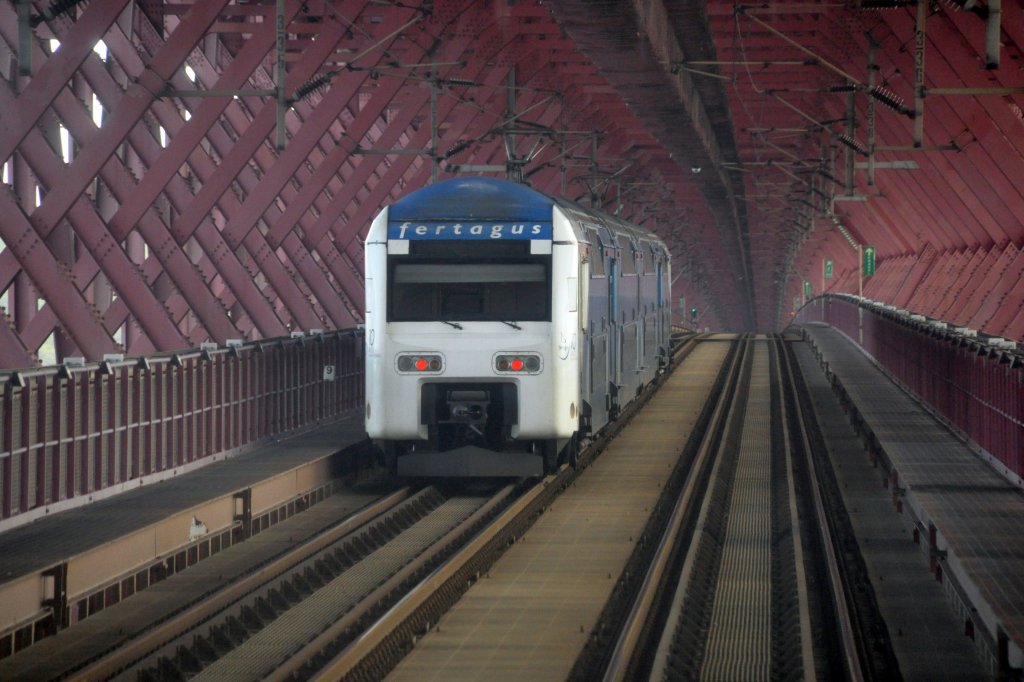 LISBOA (Distrito de Lisboa), 15.02.2011, ein Regionalzug der privaten Bahngesellschaft Fertagus auf der Ponte 25 de Abril in Richtung Süden (fotografiert durch die Scheibe des letzten Wagens und auch nicht spiegelverkehrt, da in Portugal beim Bahnbetrieb Linksverkehr herrscht) Reinhard Zabel