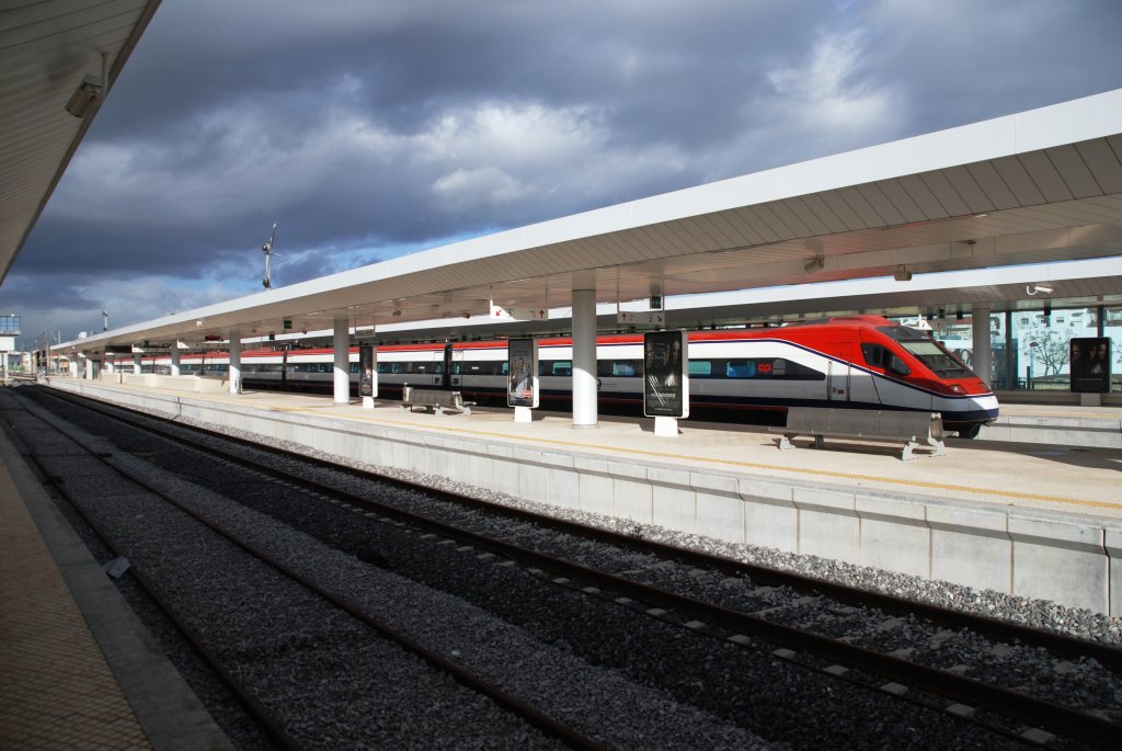 PINHAL NOVO (Distrikt Setúbal/Concelho Palmela), 19.02.2010, Blick auf einen der Bahnsteige des Bahnhofs Pinhal Novo; im Hintergrund auf Gleis 2 Alfa Pendular AP180 nach Faro/Algarve Reinhard Zabel