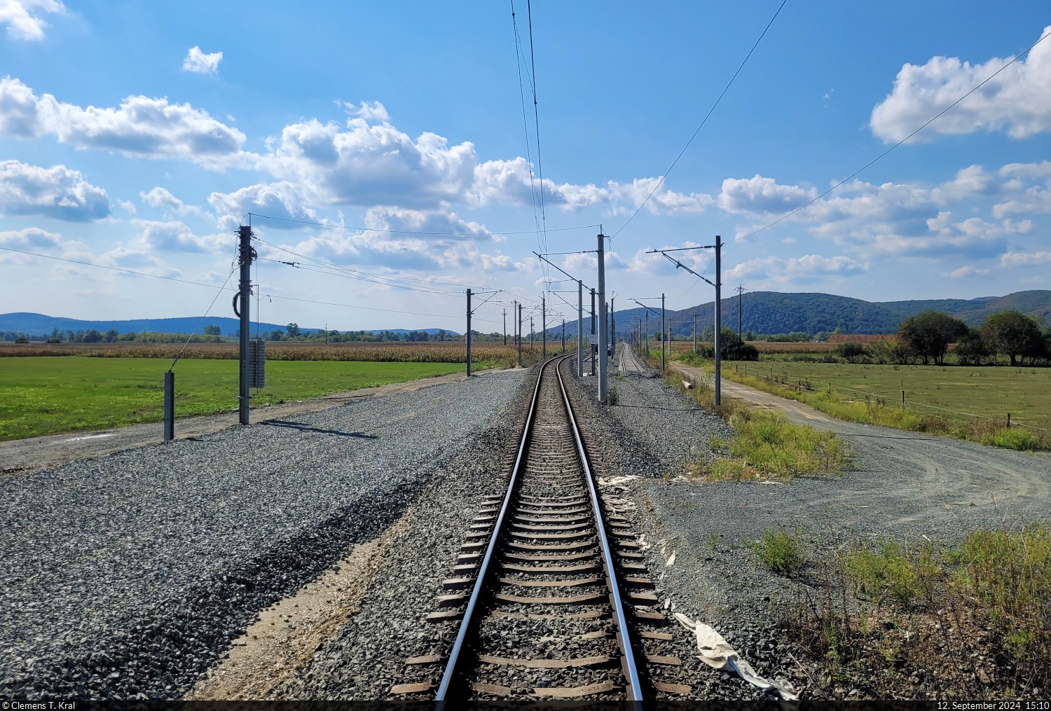 Auch wenn viele Gleise in Rumänien in schlechtem Zustand sind: Es wird kräftig gebaut. An vielen Stellen entstehen neben der bisherigen Infrastruktur komplette Neubaustrecken. Östlich von Radna (RO), am km Strecken-km 567,0, führt ein wohl provisorisches Gleis durchs Baufeld. Aufgenommen aus dem letzten Wagen des IR 75 Curtici–Brașov. 🕓 12.9.2024 | 15:10 Uhr