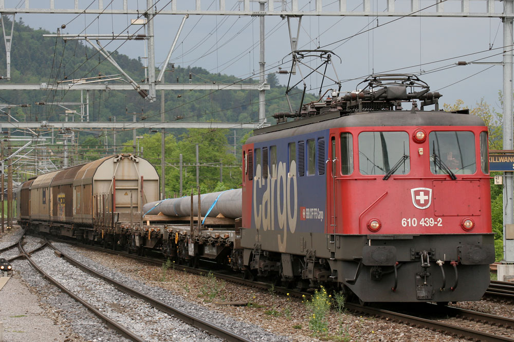 Zug 62365 (Lenzburg-RBL) passiert das Gleis 7 im Bahnhof Killwangen-Spreitenbach. An der Spitze führt diese Ae 610 2 Wagen "Bergverbot" inkl. Schutzwagen mit. Diese 3 Wagen dürfen den Ablaufberg im RBL nicht passieren. Marco Schmid